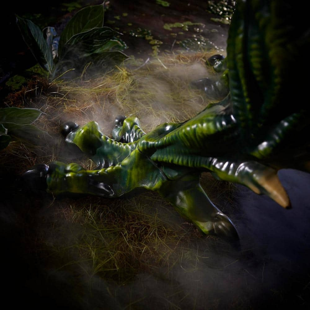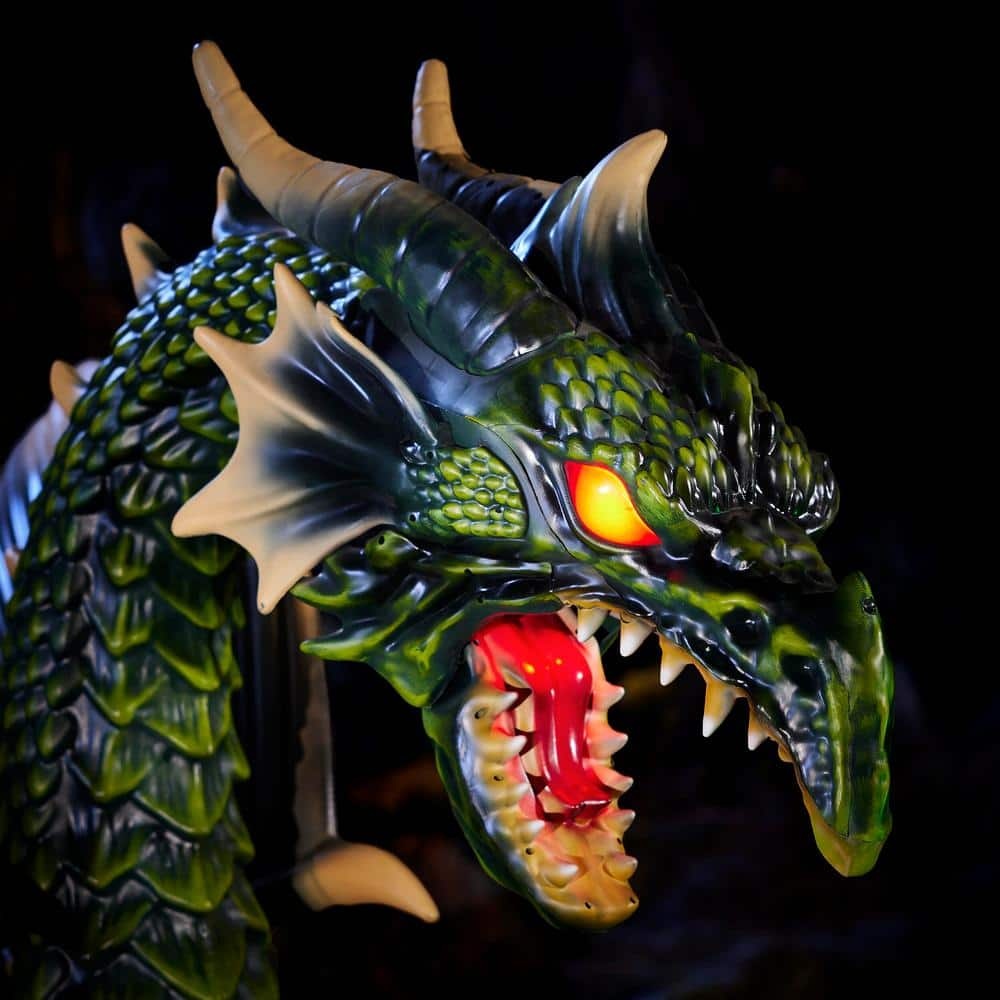 Enlist this 6 ft. Animated Giant Green Dragon to guard your front yard this Halloween. With glowing LED eyes. large wings and realistic scaly skin. this dragon will impress all your guests. The animated mouth and roaring sounds create an immersive experience and the quality materials make this dragon a part of your collection for years to come.