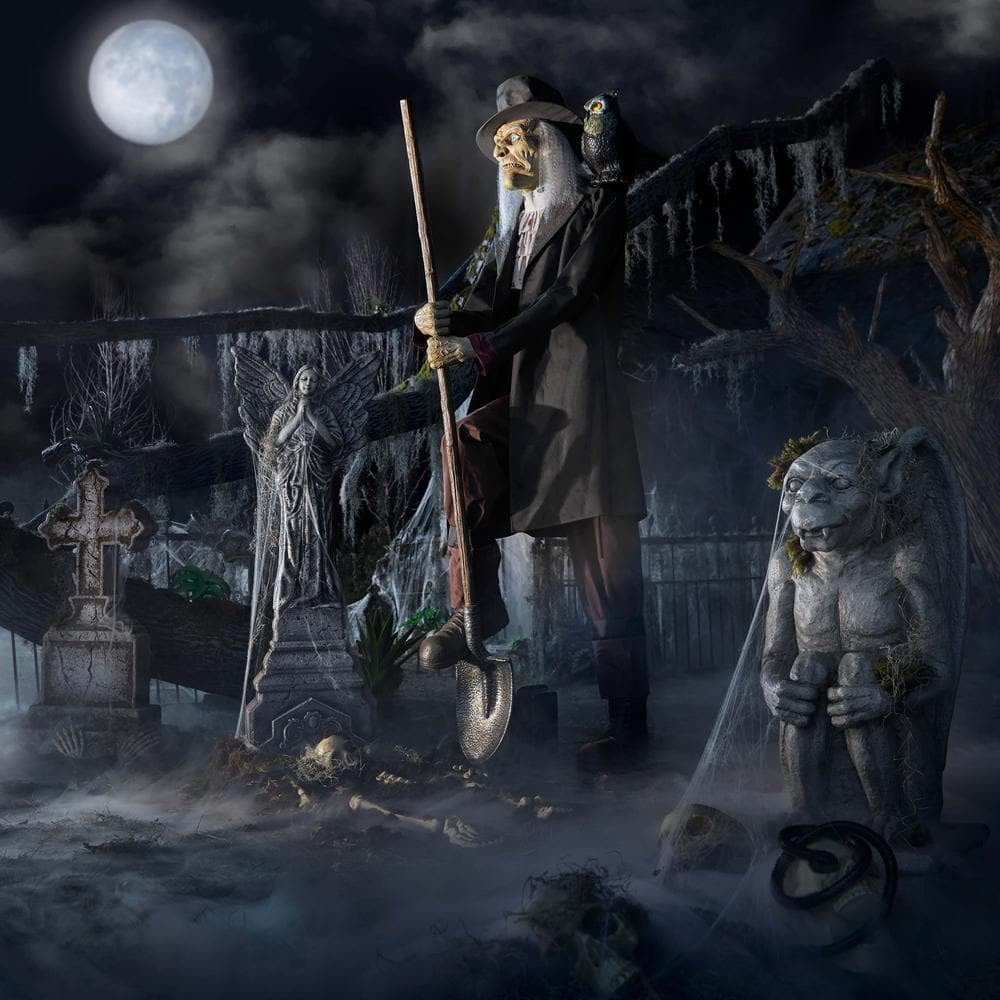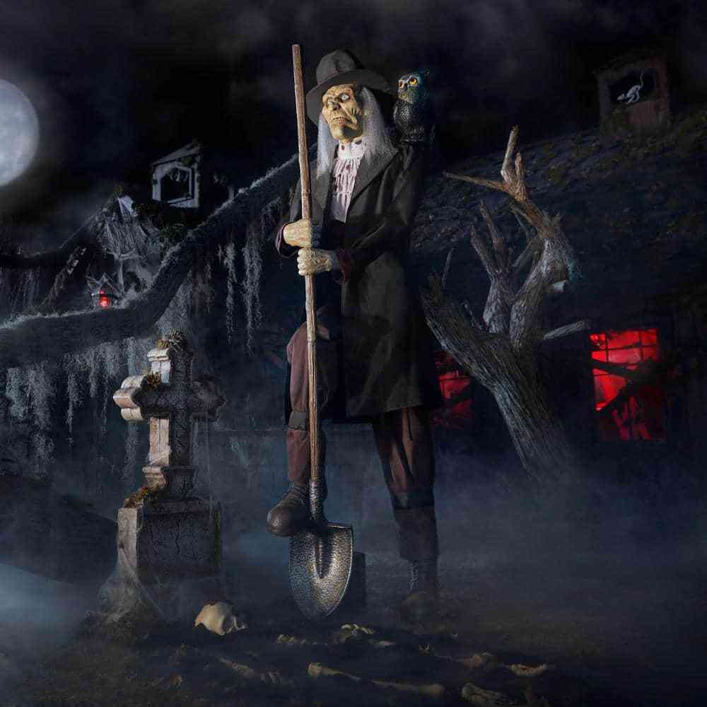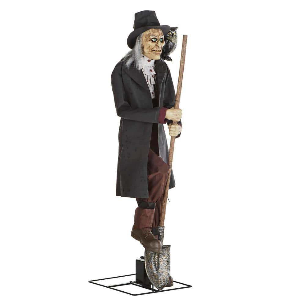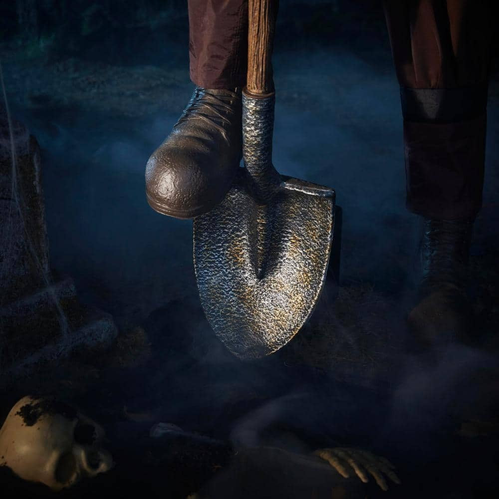 Elevate your home's Halloween decorations with the spine-chilling display provided by the 6.5 ft. Animated Gravedigger. This animatronic decoration features a realistic-looking skeleton dressed as a gravedigger poised with his shovel. The gravedigger's mouth and arms move and the speakers play chilling sounds. The sturdy construction means this decoration will be a part of your Halloween collection for years to come.