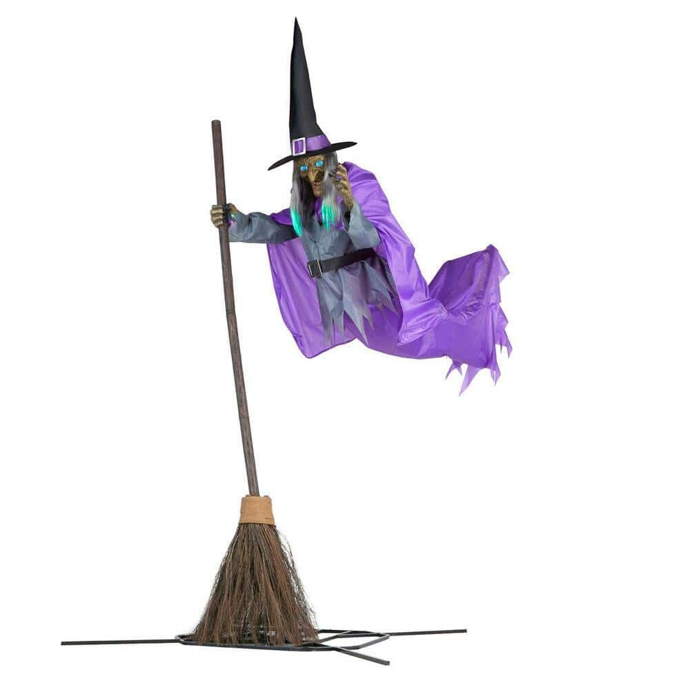 The12-foot hovering witch animatronic adds spookiness during the Halloween festivities. Featuring a life-size design. this witch figure appears to be hovering in the air to frighten your guests. Her eerie glowing presence. twisted grin and red glowing eyes are sure to send shivers down trick-or-treaters' spines. Realistic movements. cackling laughter and eerie sound effects add to the overall spooky effect. Designed for outdoor use. this 12-foot hovering witch animatronic is the perfect centerpiece for any Halloween party.