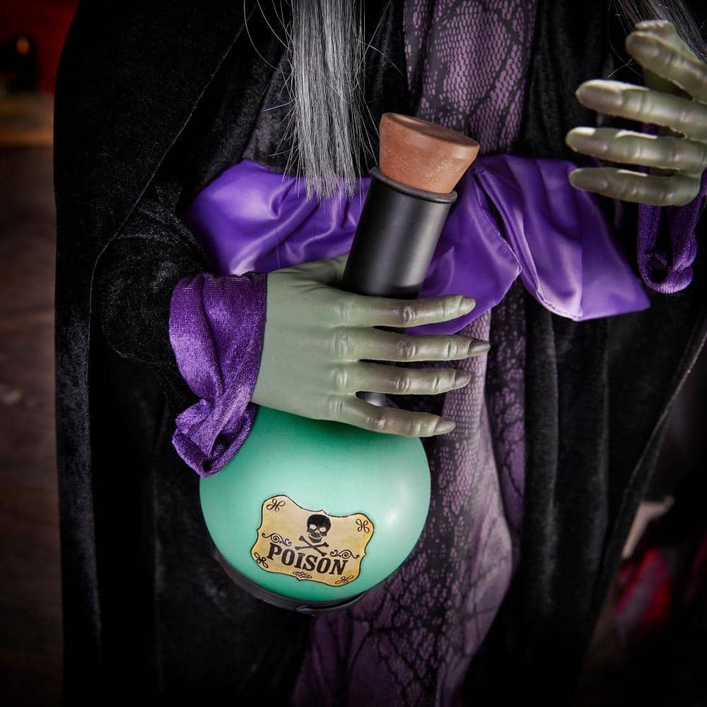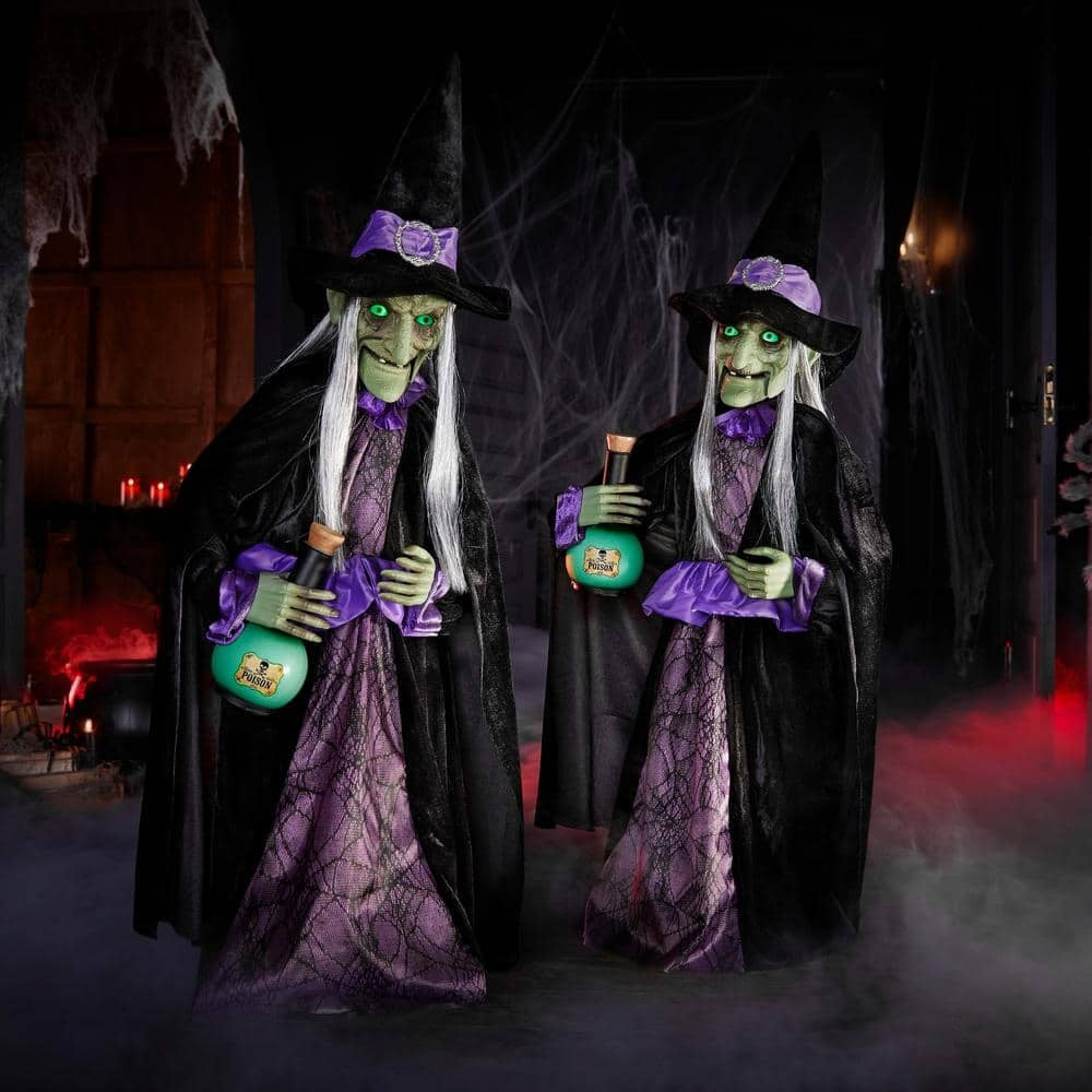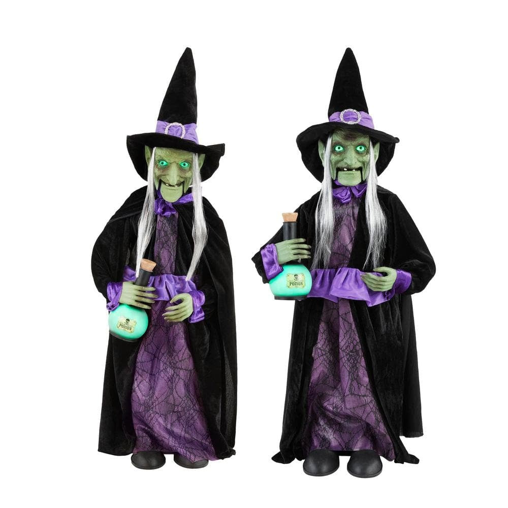 Get your Halloween grooving with these 3 ft. Animated LED Potion Witches. This set of two witches does a little dancing while wearing pointy hats and carrying green corked potion bottles. When the sound sensor is activated. the witches say spells and dance to a funky disco beat.