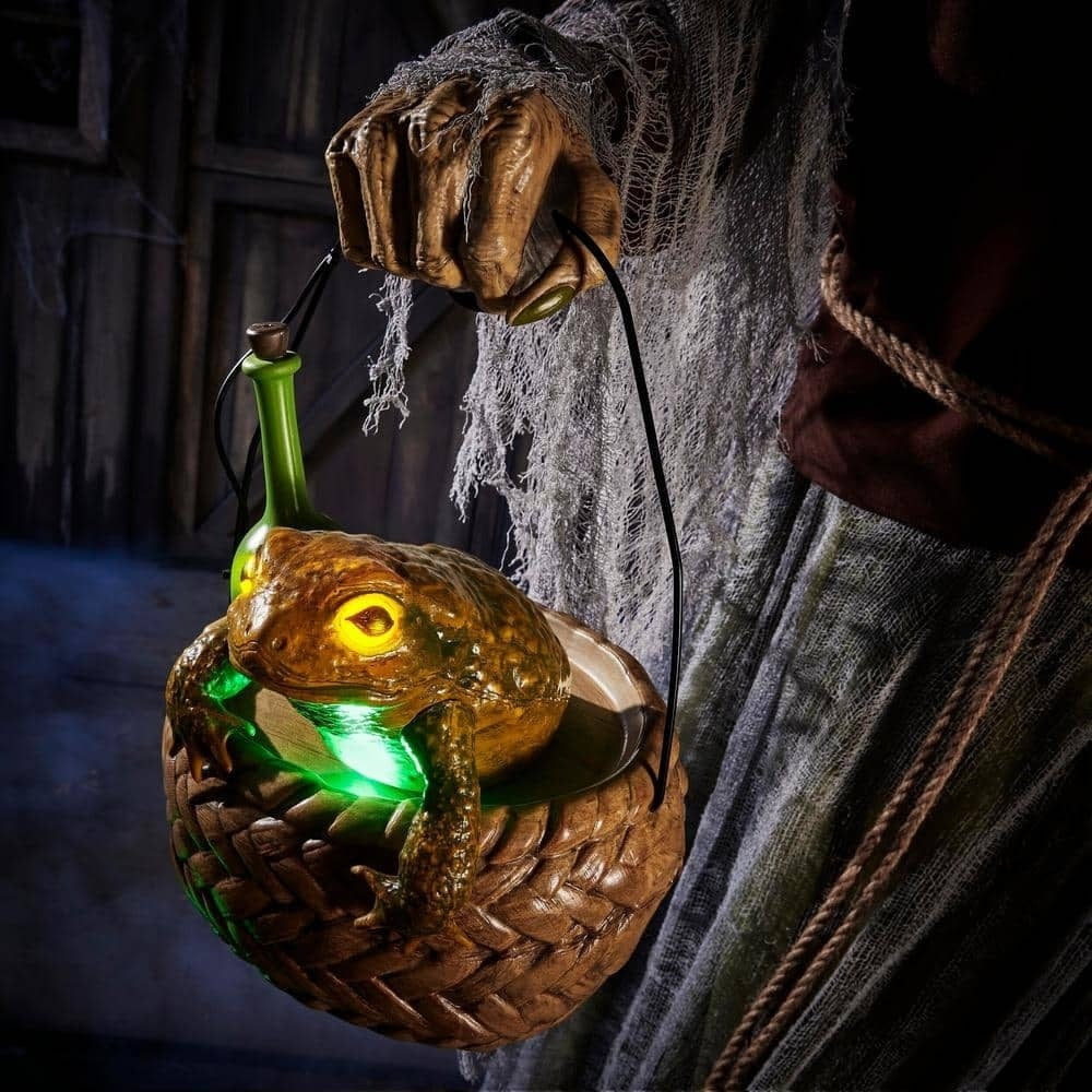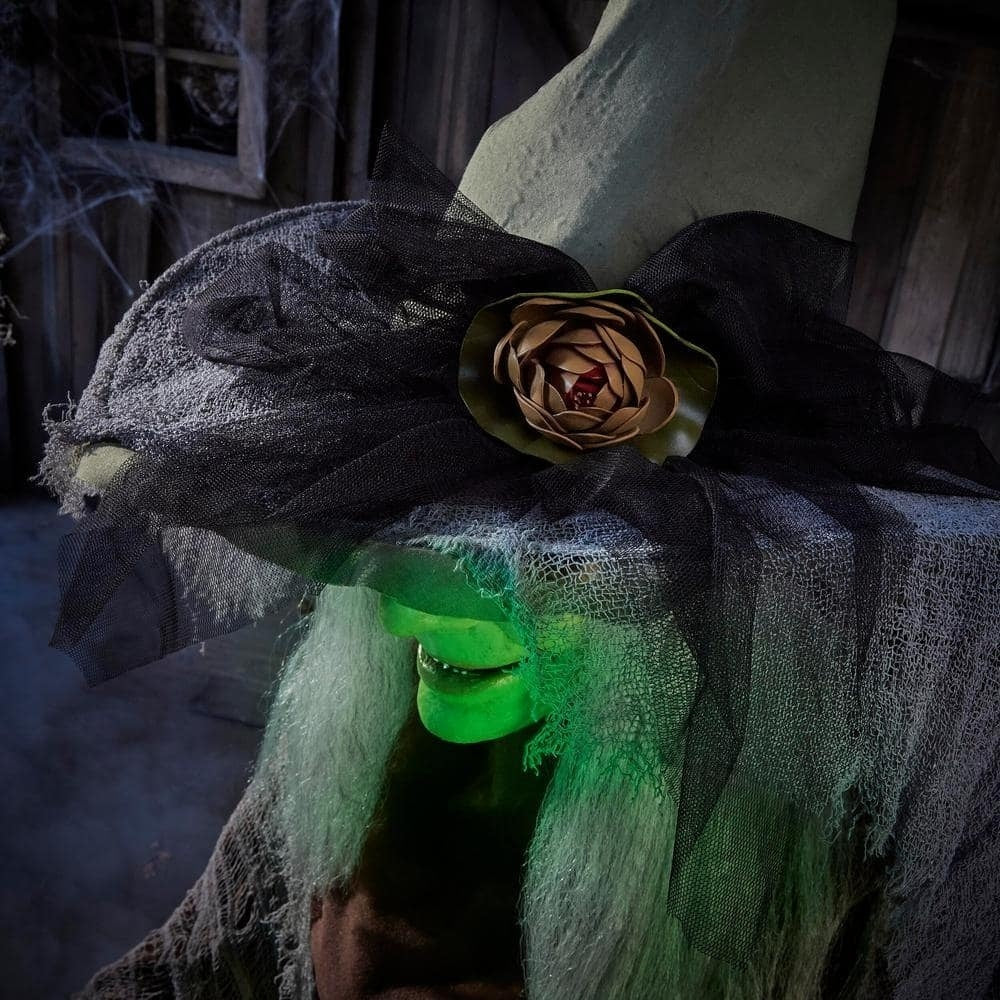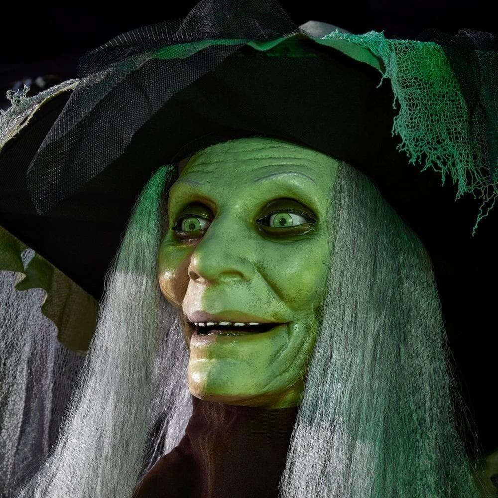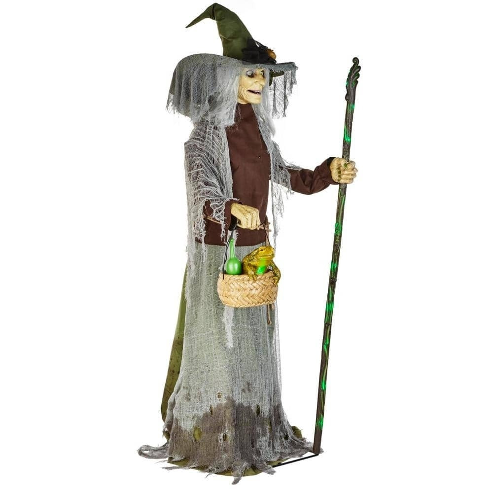Step up your home's Halloween decorations with this 7 ft. Animated Witch. This witch has realistic movements. including eye and mouth movements powered by servo motors. Haunting details. such as the witch's face. clothing and cackle will be sure to make an unforgettable impression on trick-or-treaters. A green LED light illuminates the frog in the witch's basket. This item is a great piece to add to your indoor Halloween scene.