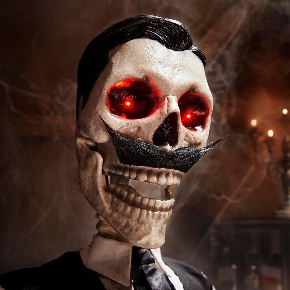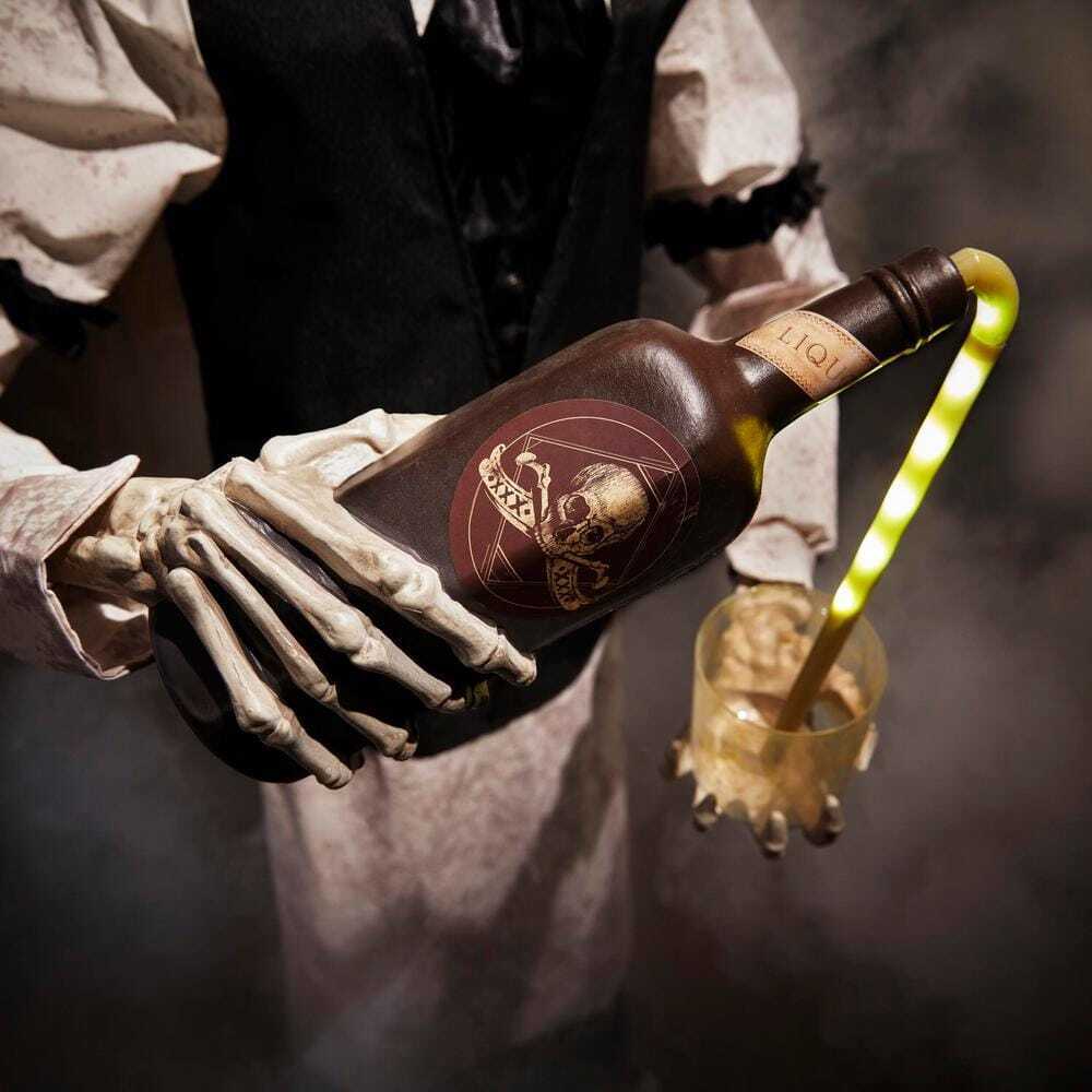 Stir up scares with this 6 ft. Animated Dean the Deathologist. It features LED-powered eyes. bottle and glass for a ghoulish glow. Watch as the mouth and jaw move and tell you some creepy phrases.