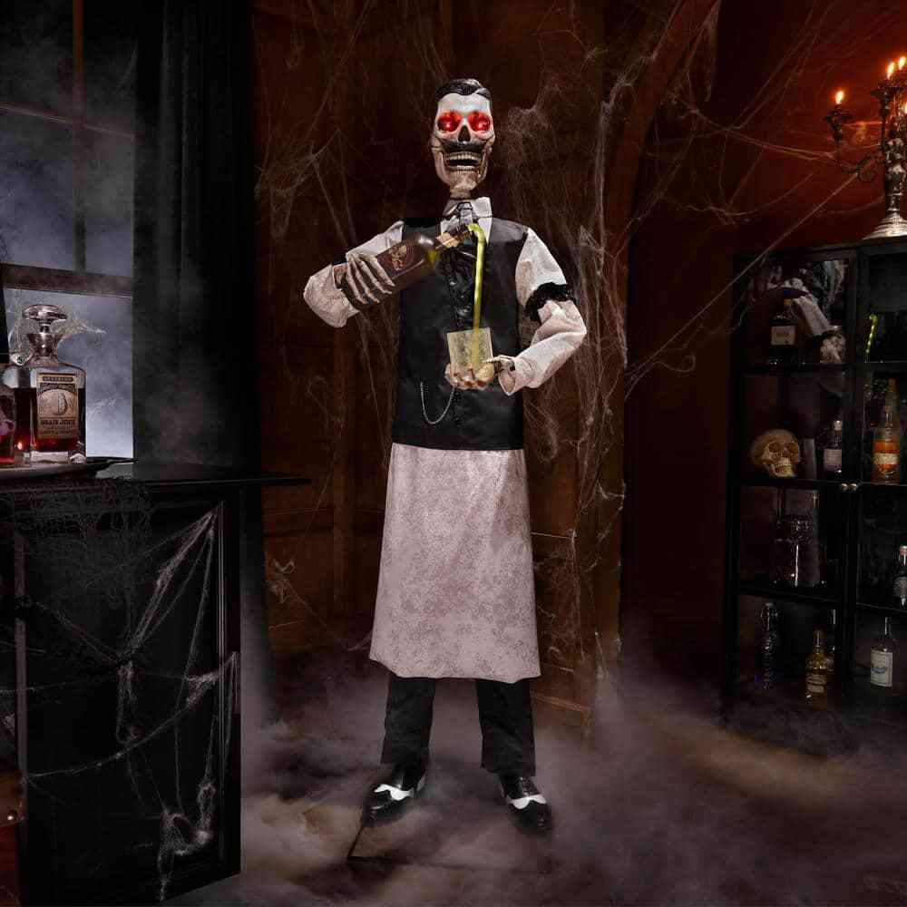 - Plug-in powered bartender with dapper outfit and dusty bottle and glass complete the macabre setting