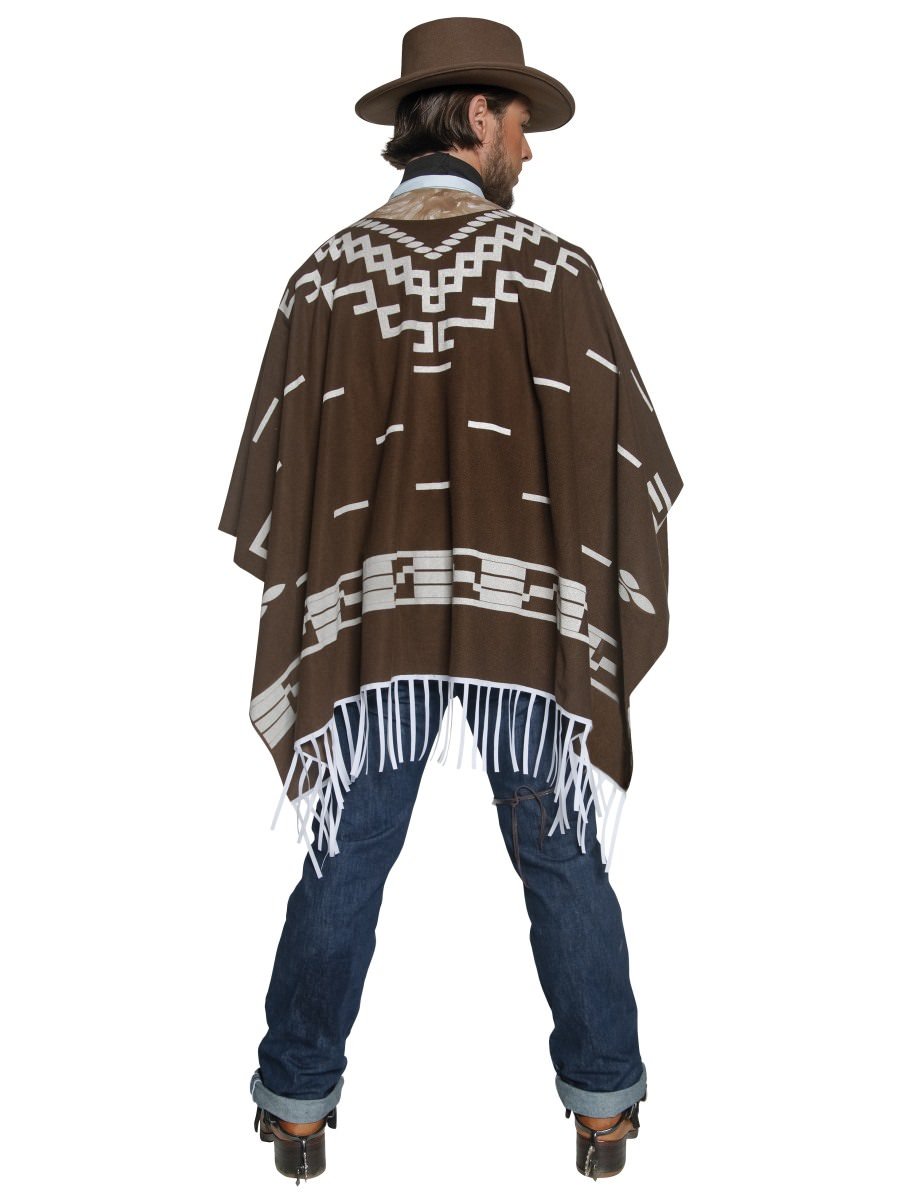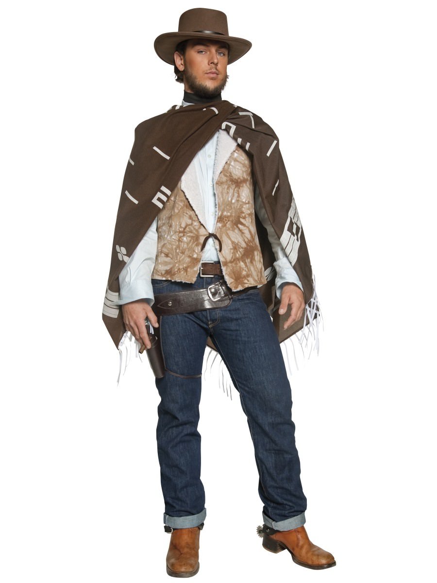 Guys. play Cowboys and Indians with the Authentic Western Wandering Gunman Costume. Included is a poncho. vest with faux shirt and neck scarf. It's perfect for that Western themed fancy dress party. Yeehaw!.