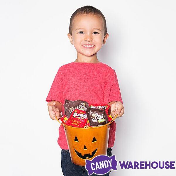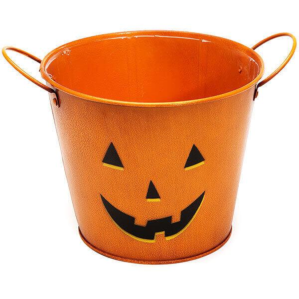 Display your Halloween candy with pride in this festive metal pail perfect for seasonal parties and events. The pumpkin pail design makes an excellent way to make a boo bucket for friends and neighbors. The sturdy metal design with handles makes for an endless array of applications for the Halloween season!