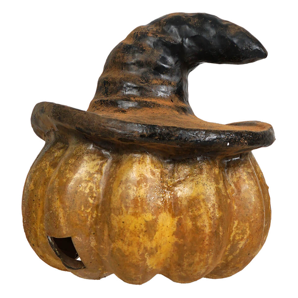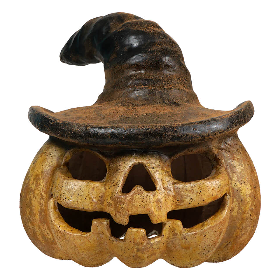 Add that perfect touch of warm spice to your fall decor with this classic Jack o' lantern decoration. The Carved Mustard Pumpkin With Black Hat has both a timeless look as well as a fabulous fall aroma that is sure to captivate your guests this fall season. This paper mache jack o' lantern's light dusting of cinnamon. not only gives it its cozy scent but also enhances its rustic charm. Make it the centerpiece of a table display or give it a place among a collection of paper mache pumpkins. This piece has a charming quality that embodies the essence of the season. no matter where you decide to put it!