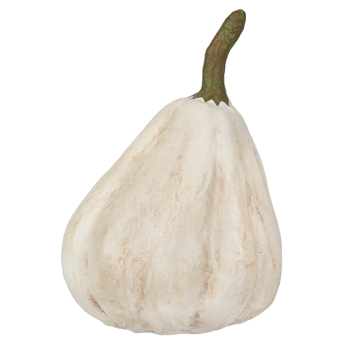 A Bethany Lowe design. Another fabulous gourd to add to your collection! It's time to get spooky with the Ghostly Gourd. a frightened little gourd with a ghostly white appearance and shocked face. This ghastly paper-mache jack o' lantern has a unique white coloring that is sure to stand out in the darkness. We love the two creeping spiders heading toward its while vellum eyes. They give this gourd an extra level of startled personality! Additionally. there's a hole in the bottom that allows you to add an electric light or tea light to let his face really shine! Add him to a patch of expressive jack o’ lanterns or give him a place of prominence on a table. fireplace hearth or your mantel. Wherever you put him. the Ghostly Gourd will inject a touch of spooky fun to your decor.