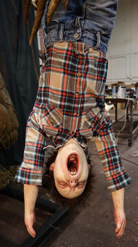 - Realistic carving details are creepy and the swinging head moves in a grotesque way to scare trick-or-treaters and guests