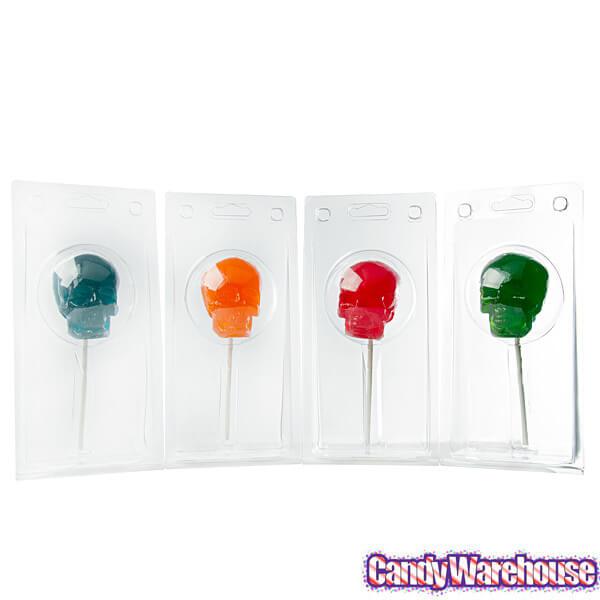 The fear of bones is commonly known as cartilogenophobia. If you don't have it. you might develop it once you hold these remarkably realistic gummy skull candies on a stick. Tear into the top of a cranium and keep gnawing away until you've devoured down to the lower jaw. Each box contains an assortment of fruit flavors distinguished by the colors blue. green. orange and red. Beware. the sweet gummy taste is addictive. and you just might develop a penchant for cannibalism while you consume one spooky head after another.