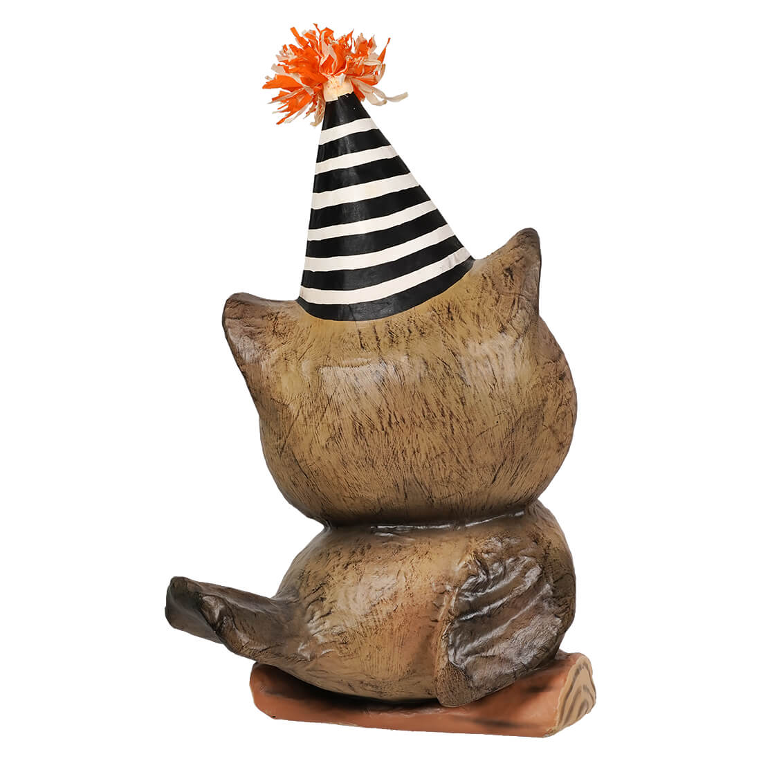 A Bethany Lowe design. Hoot. Hoot!!! Calling all Halloween-lovers! It's time to get ready for the spookiest night of the year. and we have a fun decoration that will help you deck out your space with a touch of whimsy and charm. Hoot is a friendly little owl that will become the delight of your party and a favorite each Halloween you display him. He's made of paper mache. making him robust and sturdy yet light enough to move from spot to spot. At 17 inches tall. he stands easily on a mantel or shelf among other figures or as the center of attention to attract all eyes with his cheerful Halloween party hat and trick or treat pumpkin bucket. This friendly owl will be sure to make your festivities even more special. so if you are looking for something spooky and fun to add to your Halloween decorations. look no further than our adorable Hoot!