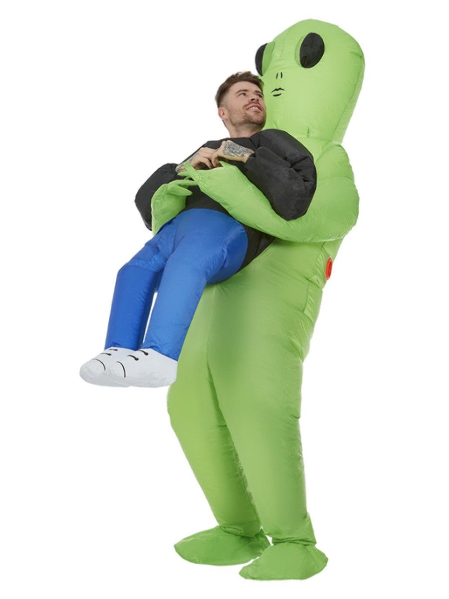 In this out-of-this-world Inflatable Alien Abduction Costume. you get to look like you're being carried off by a big green man from Mars - but here's the thing. it's you all along! Designed to create the impression of being abducted in the arms of an alien. the all-in-one costume gives your legs to the alien and your arms and head to the 3D "little you" being lifted up in its inflated arms with scary fingers - clever stuff! The suit is inflated with a built-in fan and the classic alien head with big black eyes towers over your own head to add to the effect. Attached shoe covers create a green head-to-toe look and elasticated ankles and wrists help to keep the air inside the costume. Guaranteed to grab attention. you can really get carried away in this outfit!Â