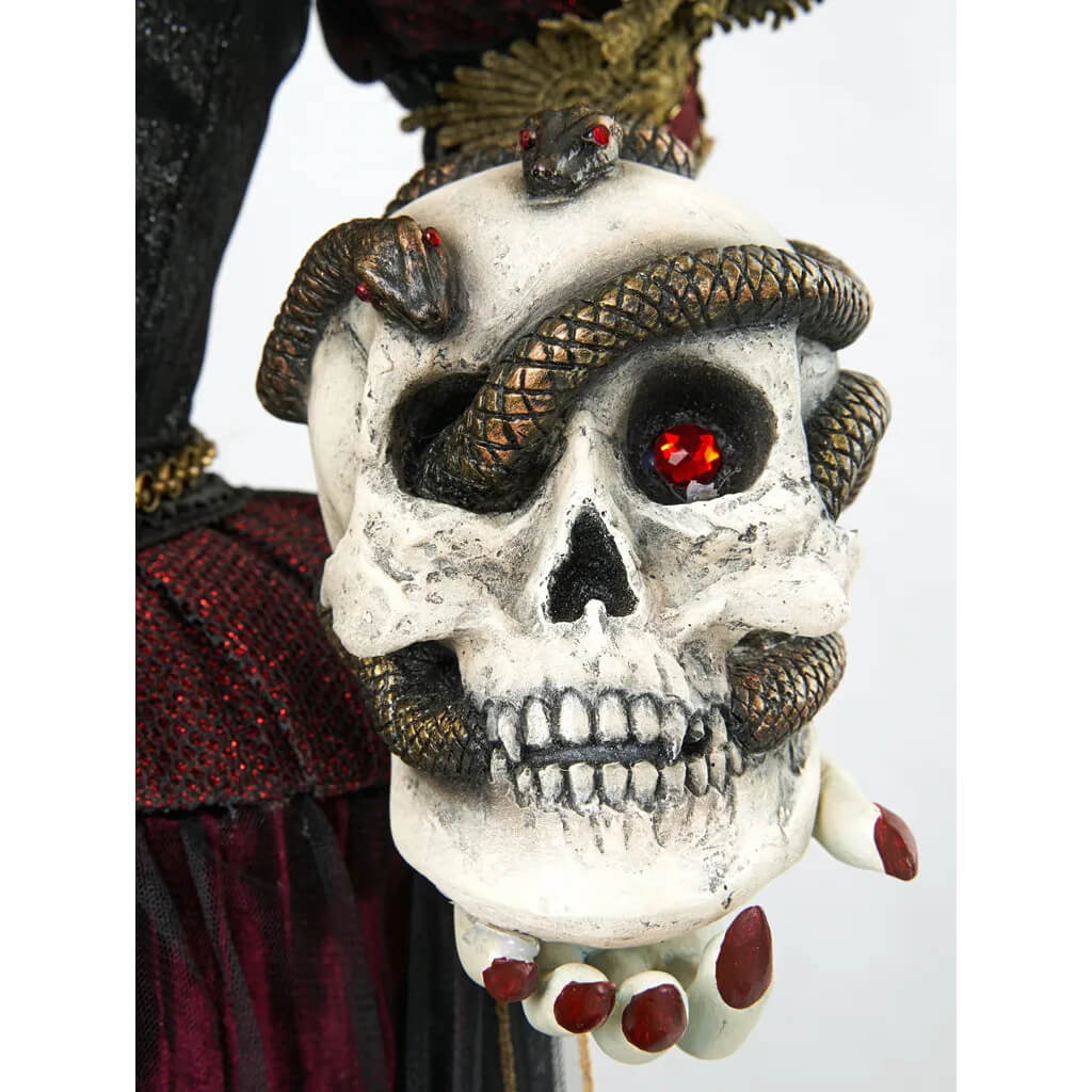 Greet your guests with a frightful sight this Halloween. Lady MacDeath Life Size Doll with her regal. ghastly appearance is sure to give any guests a fright. This remarkable lady is crafted with exquisite care and attention to detail — featuring a golden crown adorned with jewels. dark burgundy and draped black lace attire accented by lovely gold trimming and an iconic ceremonial dagger in one hand. along with a snake-weaved skull in the other. Her impressive 69” height coupled with her hauntingly evil countenance make her an ideal hall monitor for your next chilling get together. Scary enough to take your breath away but beautiful enough to capture your gaze — Lady MacDeath is perfect for anyone looking to add some glamorous evil straight from a medieval nightmare to their next Halloween gathering!