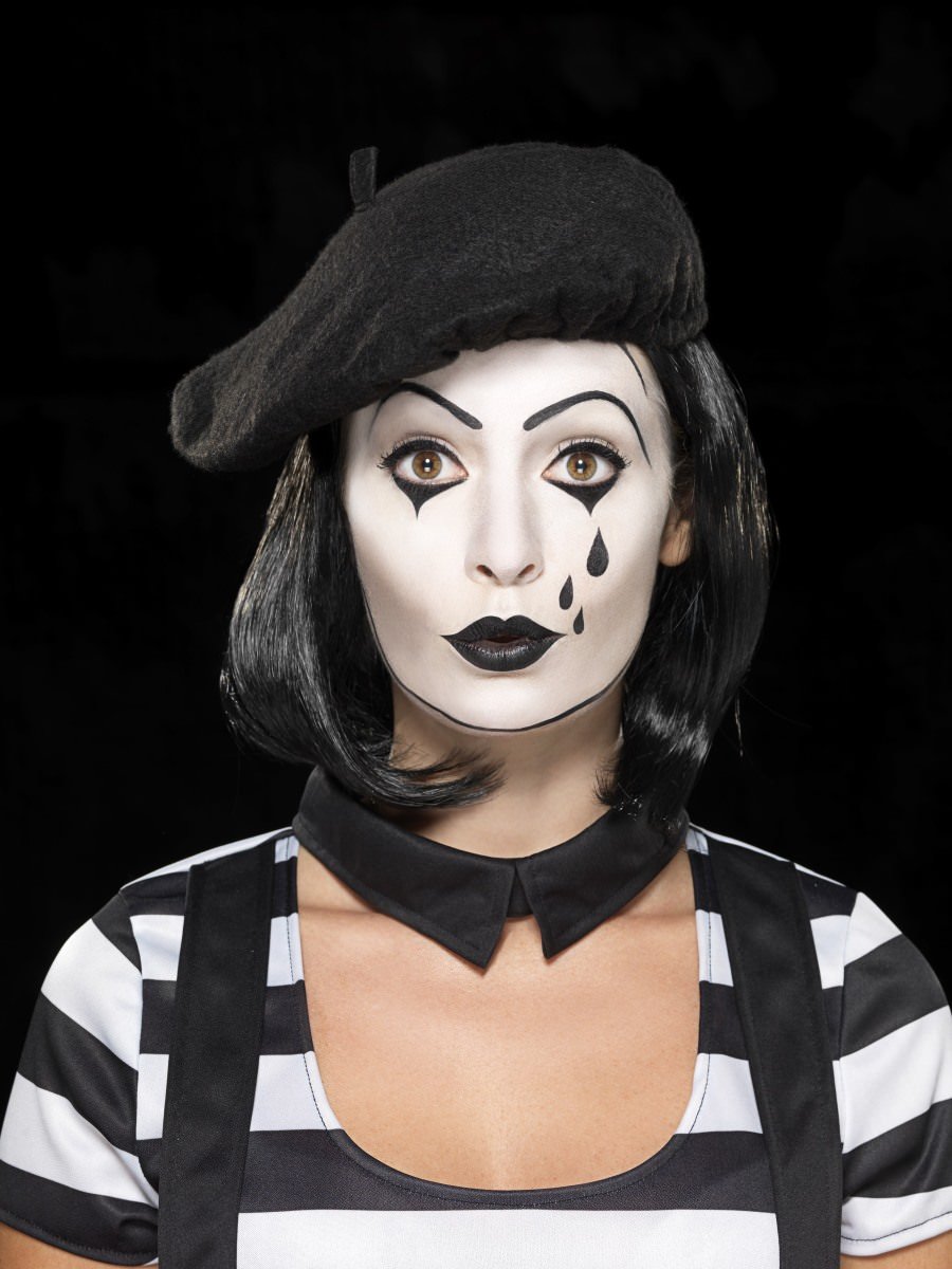 Lady Mime Artist Costume. Black. Dress. Collar. Beret. Gloves. Tights & Make-Up
