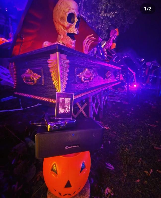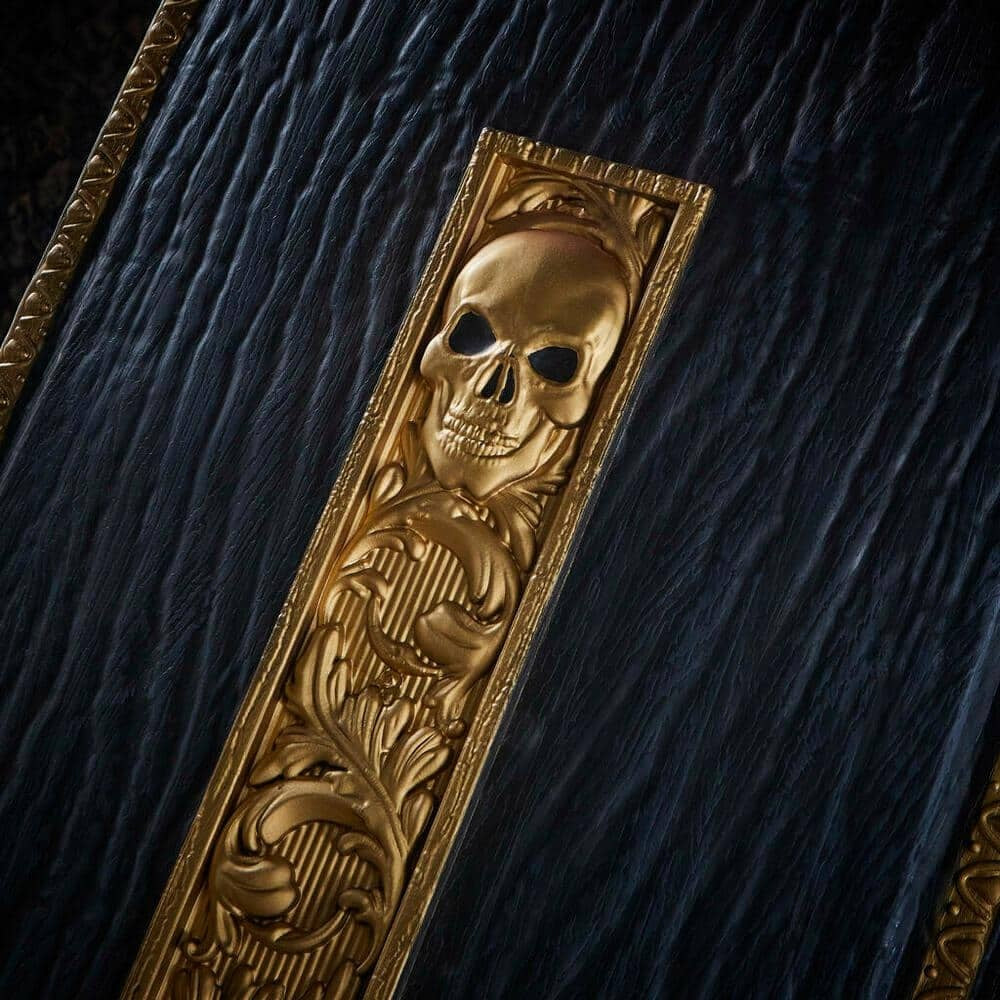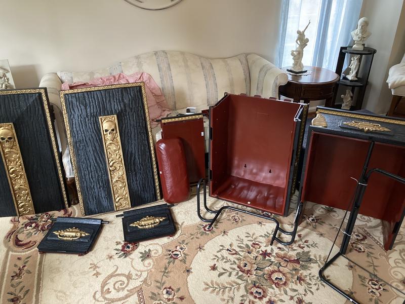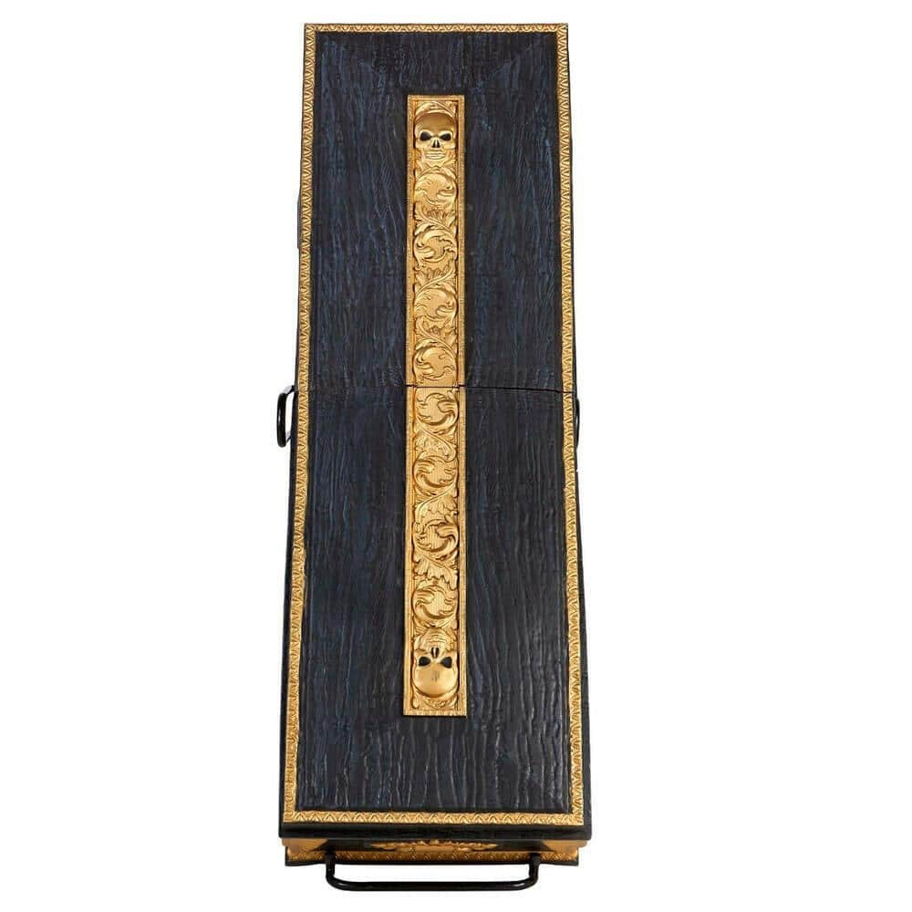 Black finish with gold accents resembles a real coffin to scare even the most daring of trick-or-treaters