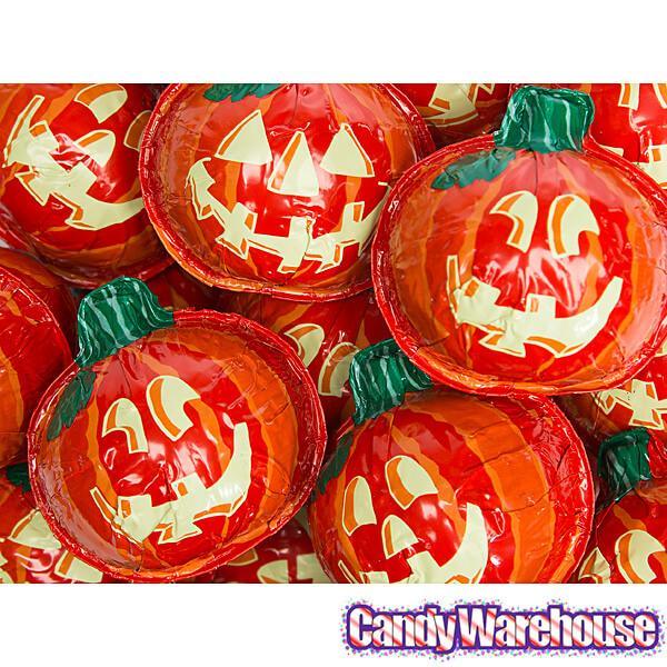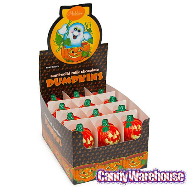 Display box contains 24 Foil Wrapped Milk Chocolate Candy Pumpkins. each with a net weight of 2 ounces.