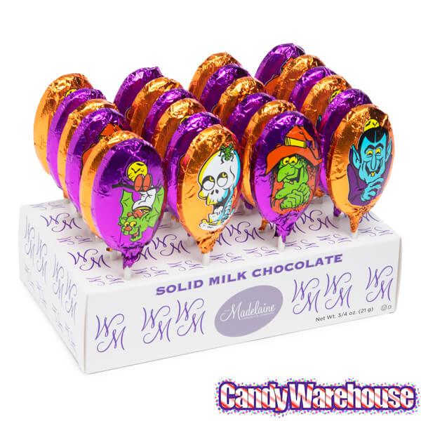 Witches. goblins. vampires. skeletons. and various other creepy creatures lurk on these foil-wrapped milk chocolate pops.