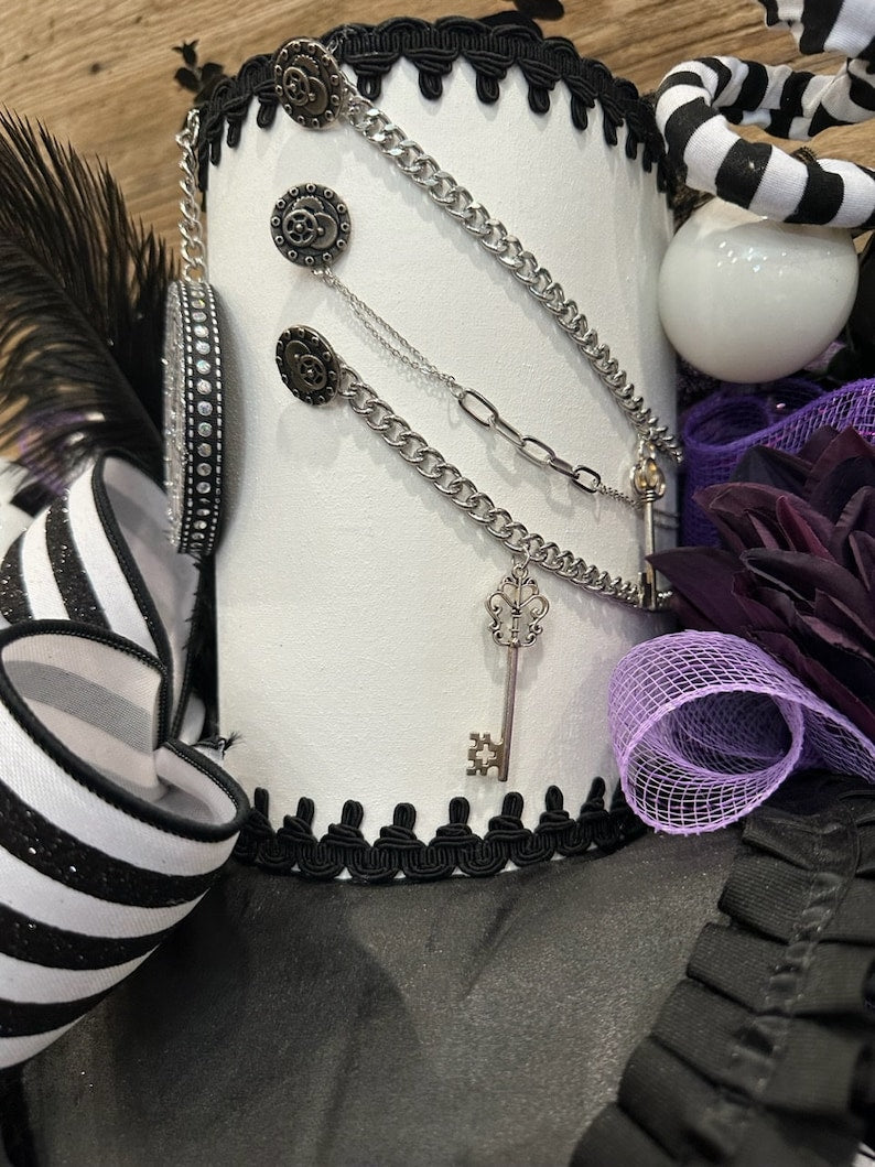 This gorgeous Skeleton Halloween wreath is definitely a showstopper! Featuring a hand-sewn. hand-painted skeleton body. legs. shoes and hat. Mr. Skelly (Petals and Plumes Members Only design) handmade by me. He is holding a battery-operated lantern in his right hand. Lots of embellishments. trim. and beautiful accents. high quality ribbon. black. white and checker ornaments scattered about the wreath. All of this is designed on a 24” pine base wreath. and accented with purple and black deco mesh. black plastic eucalyptus sprays and purple florals with eyeballs.