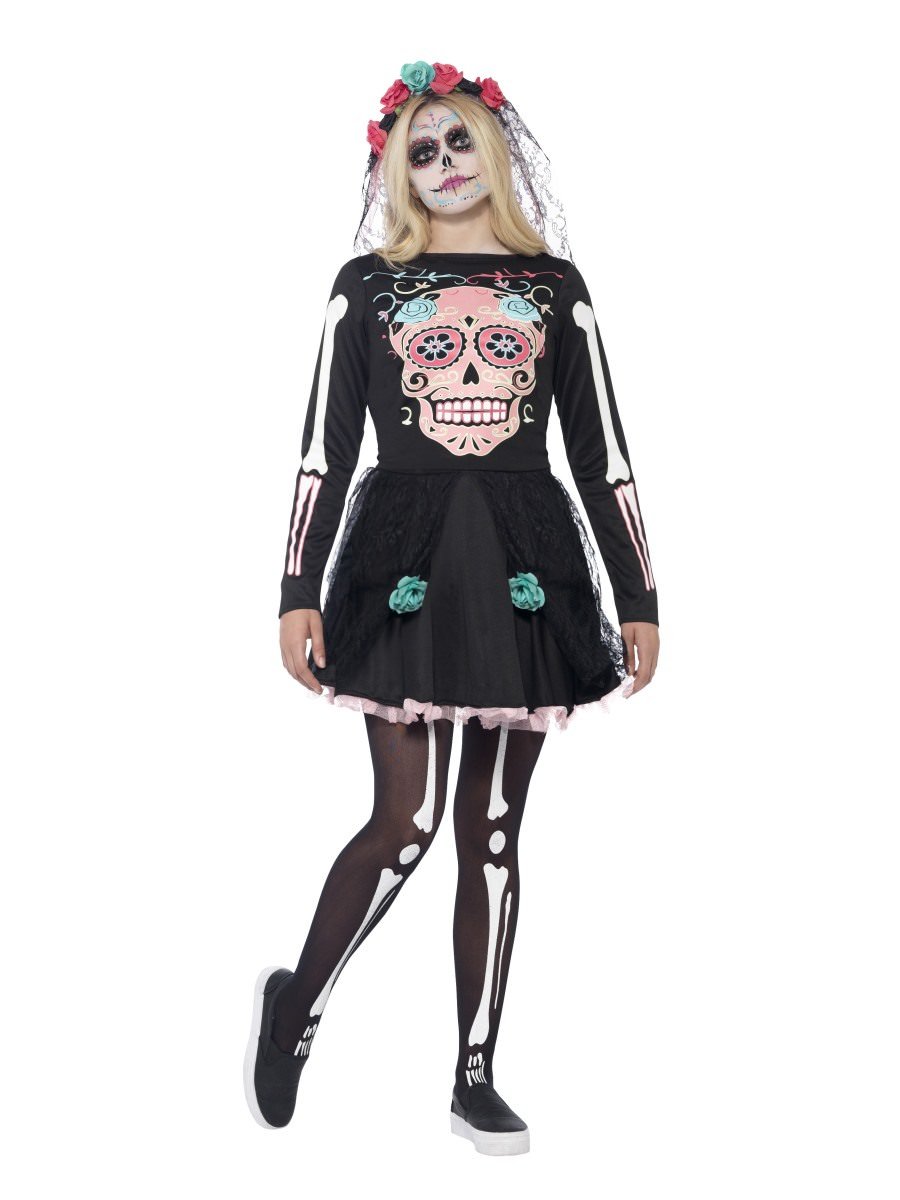 They're guaranteed to be the envy of their friends in the best Halloween costume going! The Smiffys Teen Sugar Skull Sweetie Costume is complete with a printed dress and headpiece; complete the look with Smiffys Make-Up FX face paints and a pair of skeleton print tights.