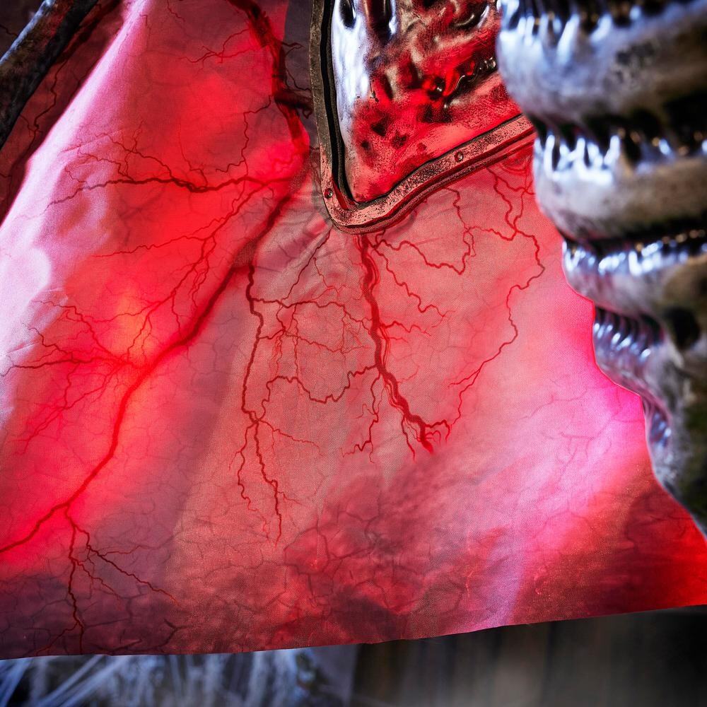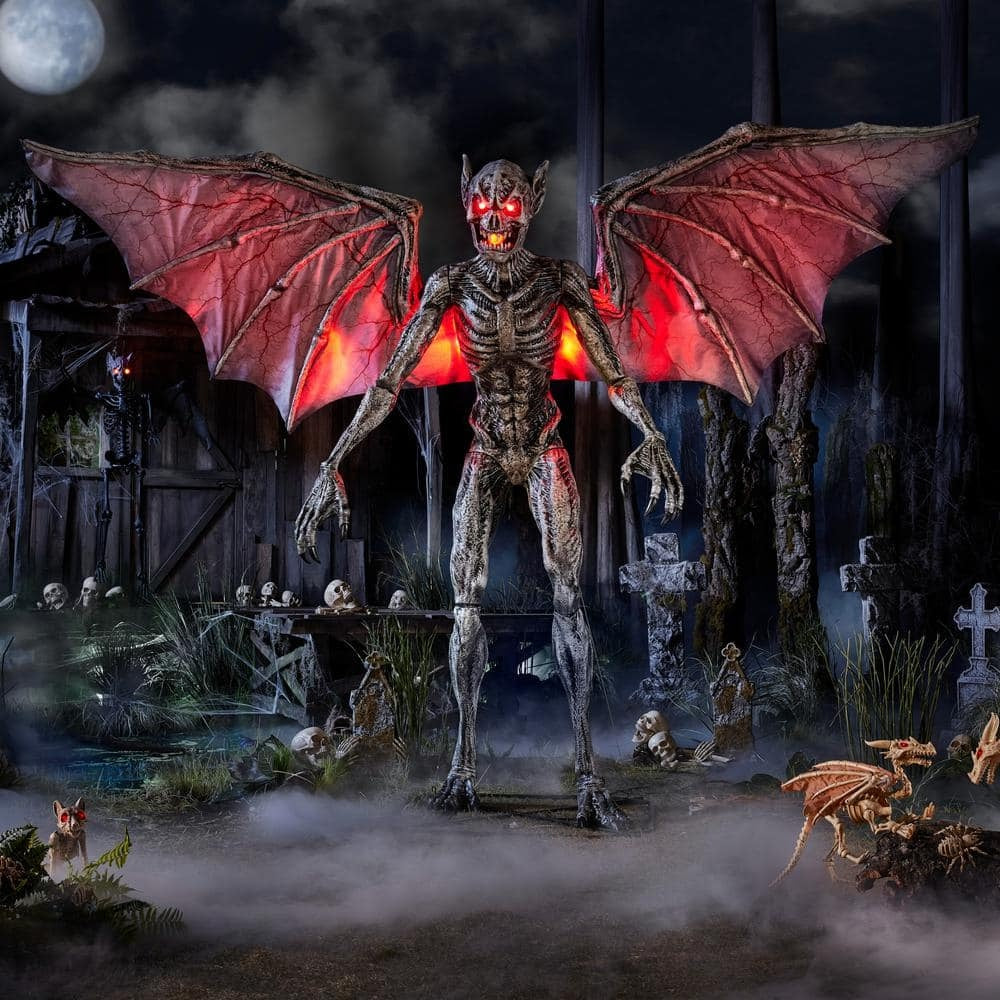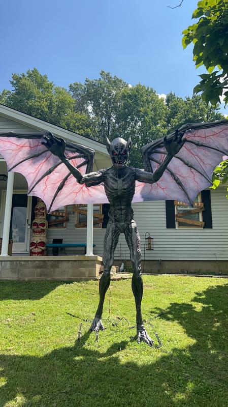 This 9-ft. LED Wide Animated Bat Man of the night inflatable adds beastly fright to your Halloween scene. To terrify your guests. it comes with a motion sensor that triggers the mouth and head of the monster to move while eerily growling. Realistic wings with a red glow span 12.5-ft. wide and add more frightful delight. This creature will add an intimidating presence to your space.